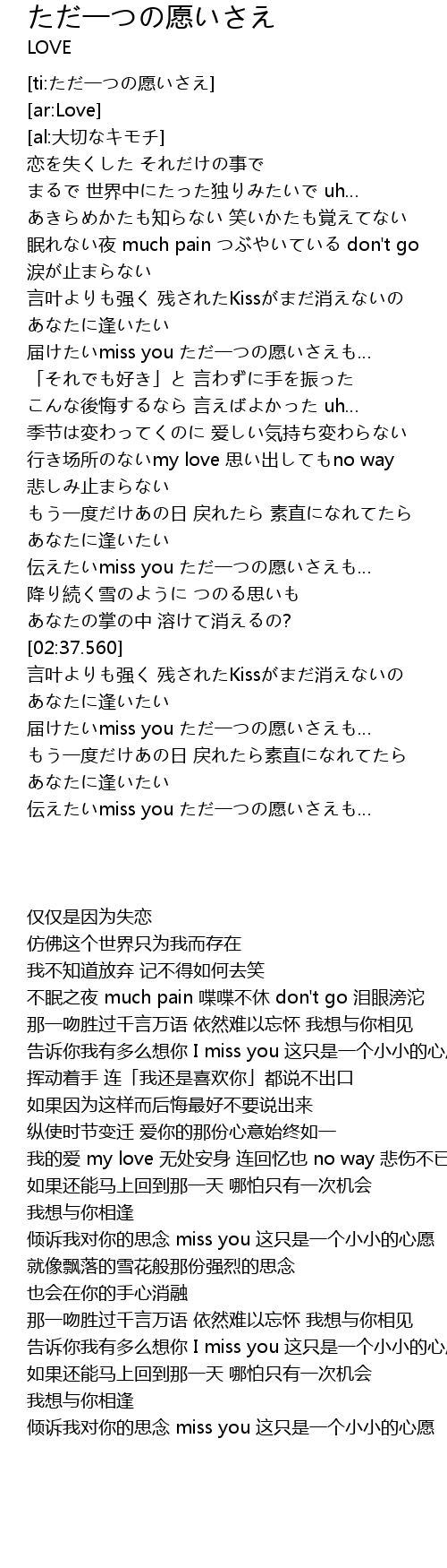 | [02:08.500] | 伝えたいmiss you ただ一つの愿いさえも… |