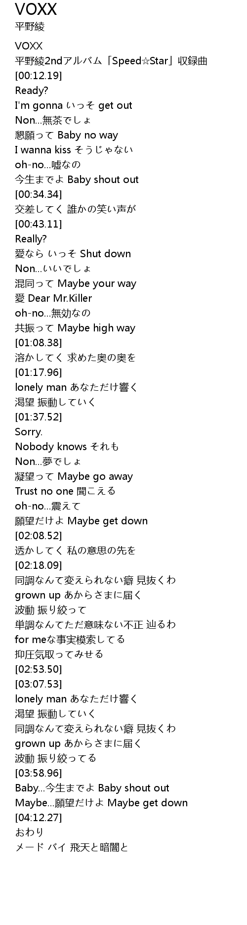 | [00:07.62] | 平野綾2ndアルバム「Speed☆Star」収録曲 |