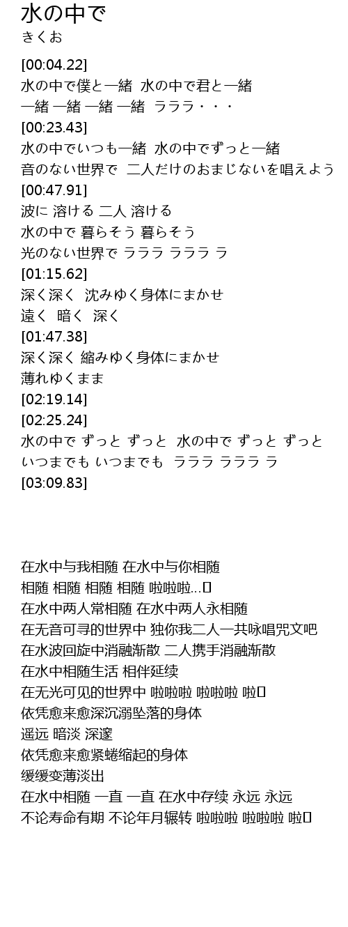| [00:24.34] | 水の中でいつも一緒 水の中でずっと一緒 |