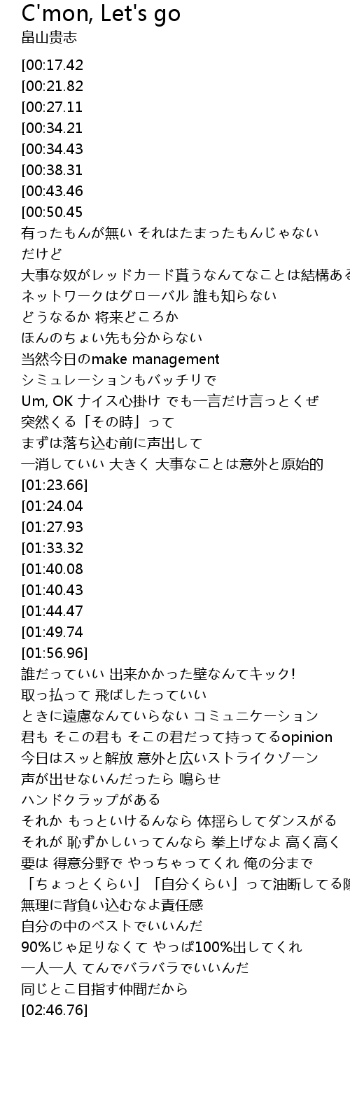 | [03:12.33][01:33.32] | Alright 行こう C'mon C'mon Let's go Let's go |