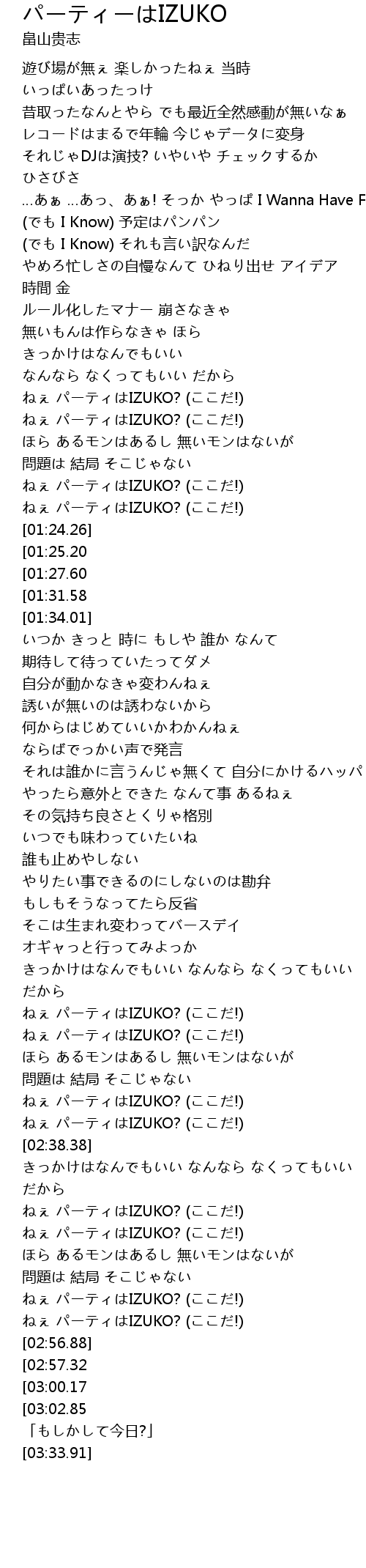 | [02:36.05] | ねぇ パーティはIZUKO? (ここだ!) |