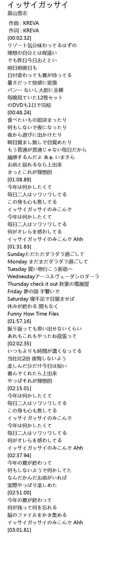 | [02:59.38] | イッサイガッサイのみこんで Ahh |