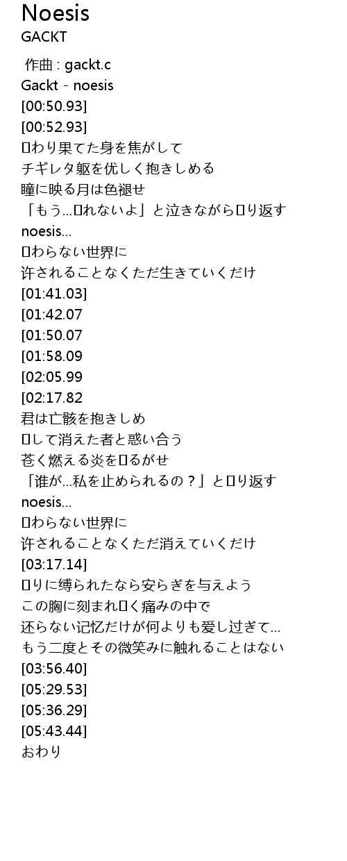 | [01:02.12] | チギレタ躯を优しく抱きしめる |