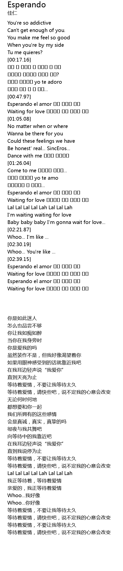 | [02:57.96] | Esperando el amor 오래 걸리면 안돼 |