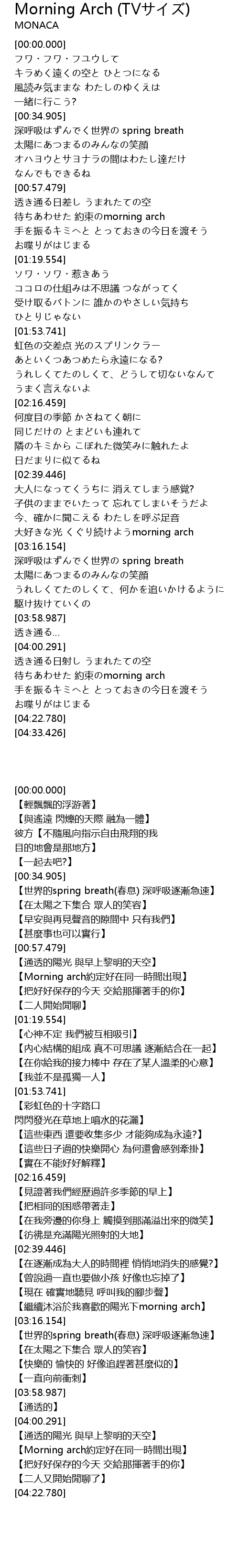 | [03:06.785] | 大好きな光 くぐり続けようmorning arch |