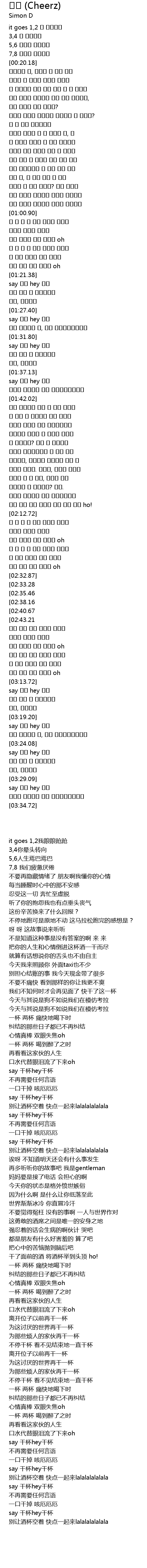 | [02:10.00] | 앞에 있는 잔을 비우자 털어 머리 위로 ho! |
