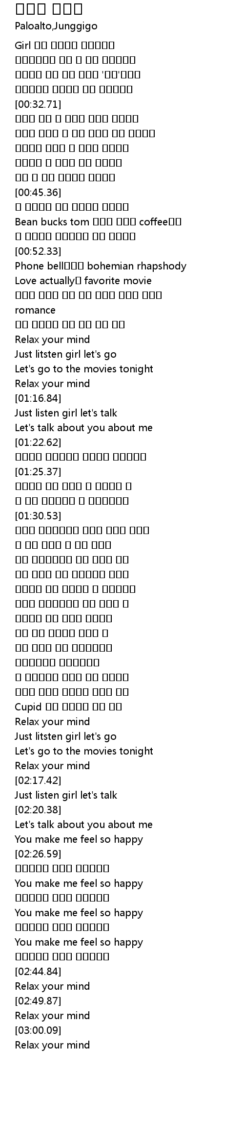 | [01:31.04] | 은은한 커피향기같은 미소가 심장을 뛰게해 |