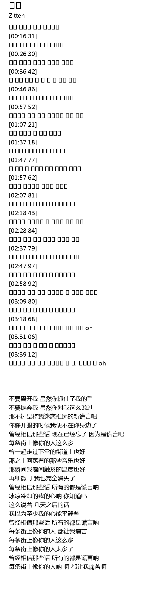 | [02:10.62] | 믿었니 그런 말 모든 게 거짓말이야 |