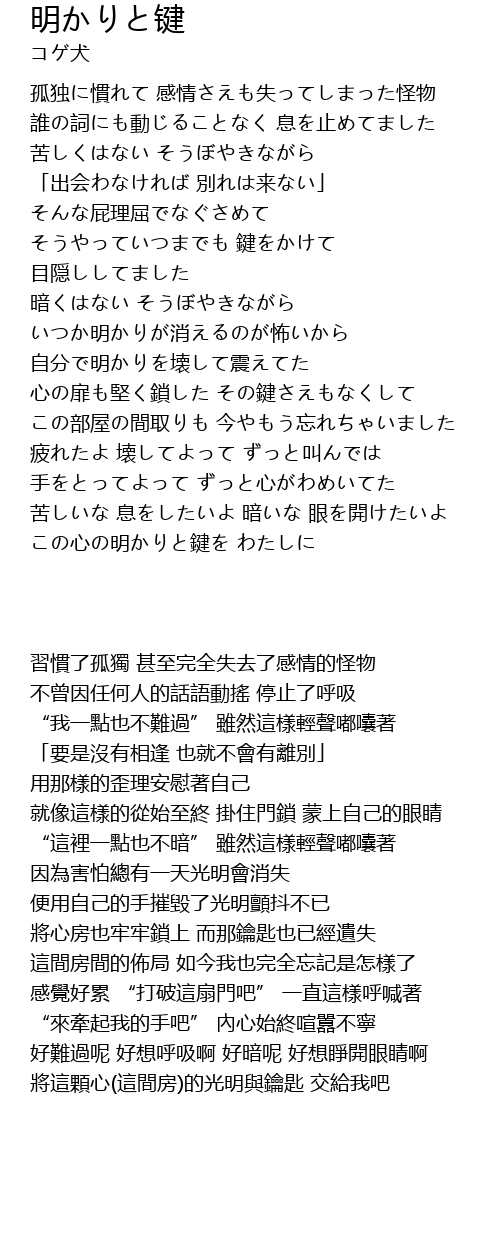 | [01:45.82] | いつか明かりが消えるのが怖いから 自分で明かりを壊して震えてた |