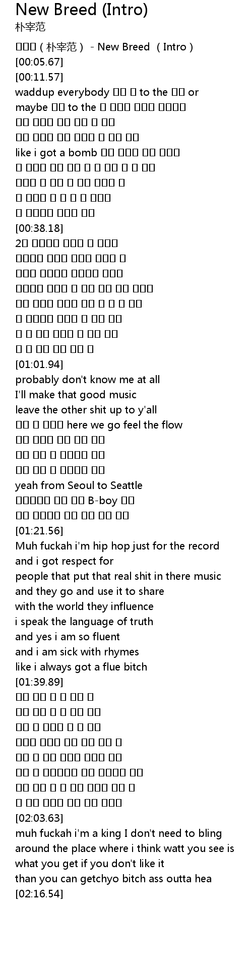 | [00:00.20] | 박재범(朴宰范) - New Breed (Intro) |