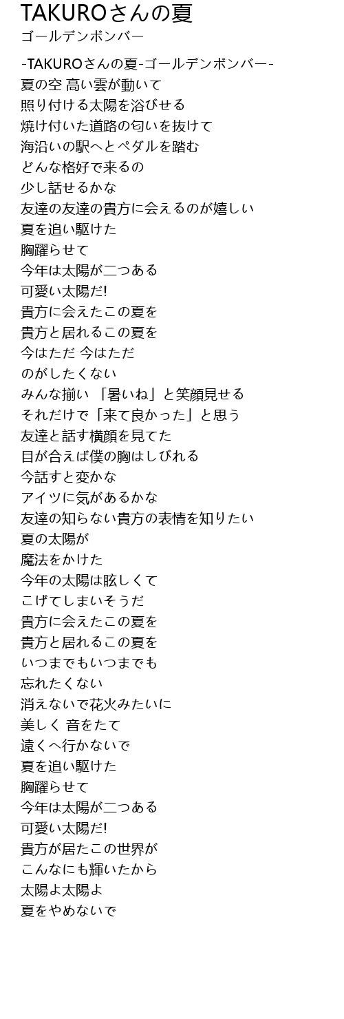 | [00:02.62] | -TAKUROさんの夏-ゴールデンボンバー- |