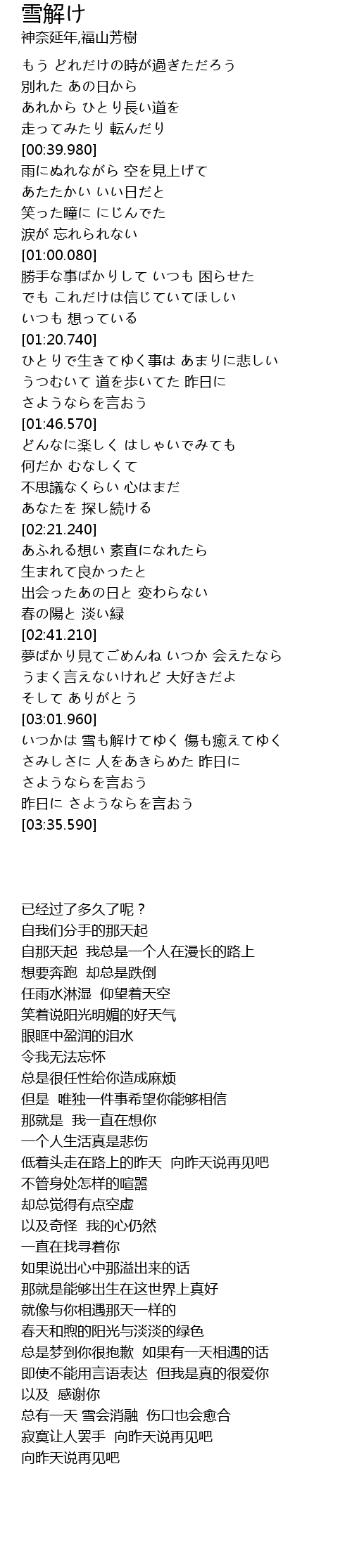 | [03:02.550] | いつかは 雪も解けてゆく 傷も癒えてゆく |