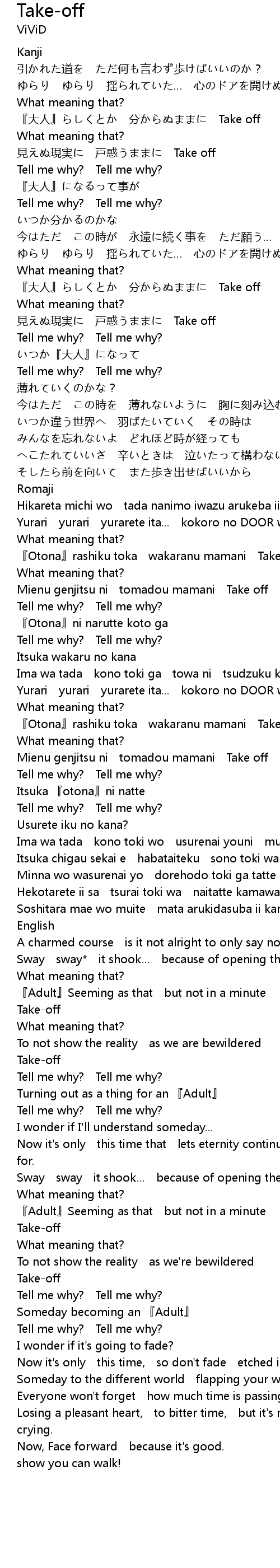 | Mienu genjitsu ni tomadou mamani Take off | |