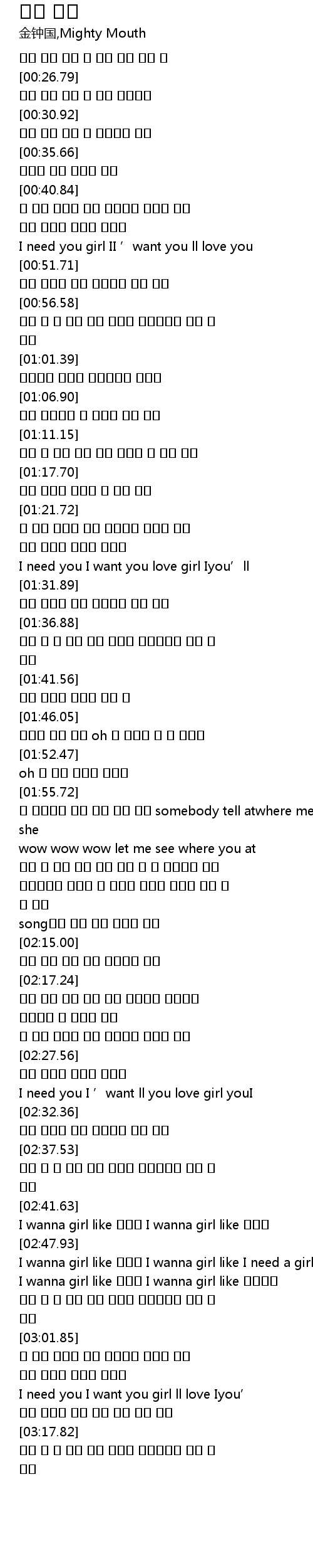 | [02:48.49] | I wanna girl like 한예슬 I wanna girl like I need a girl |