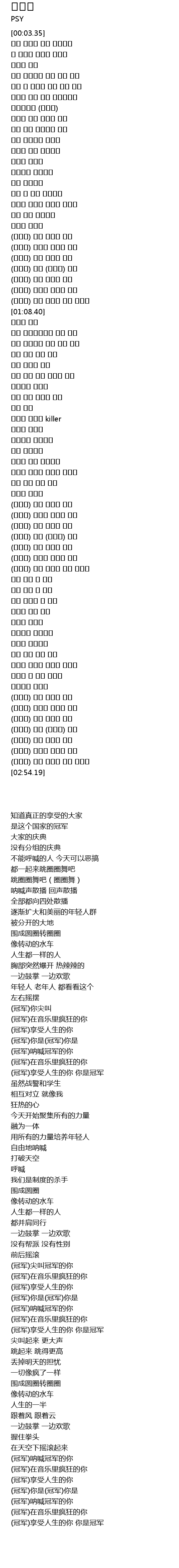 | [02:00.35] | (챔피언) 인생 즐기는 네가 챔피언 |
