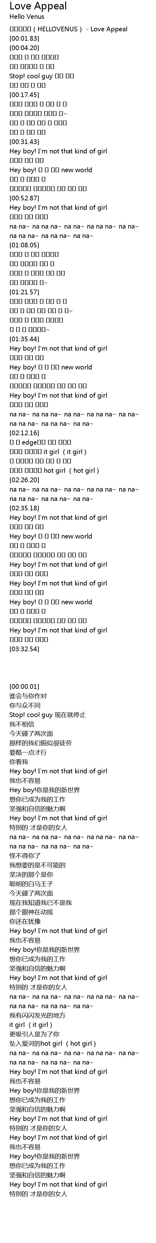 | [00:00.01] | 헬로비너스(HELLOVENUS) - Love Appeal |