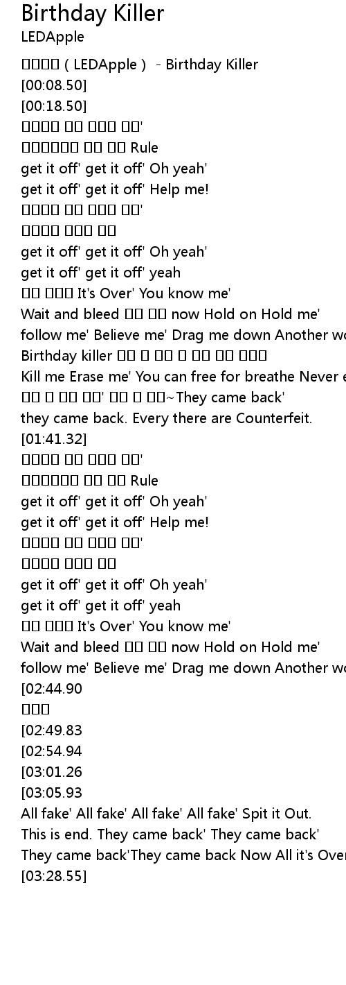 | [03:29.00][02:44.90] | Birthday killer 바로 이 순간 넌 나로 다시 태어나 |