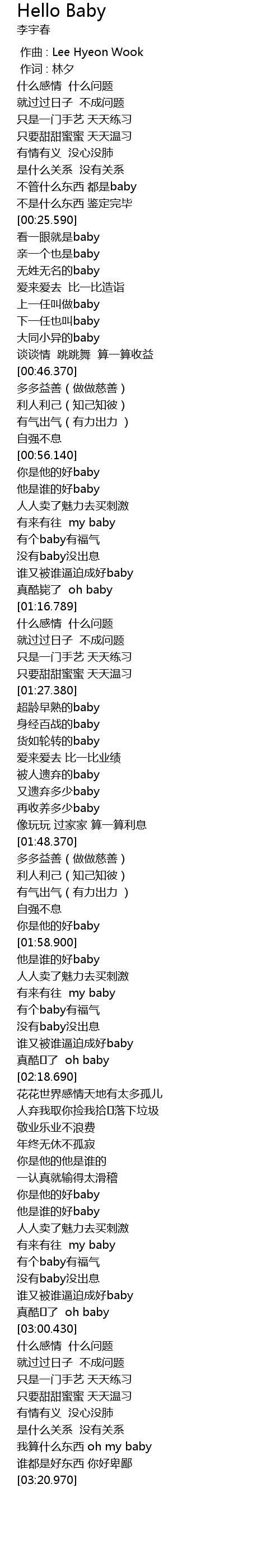 | [02:10.788] | méi yǒu baby méi chū xī |