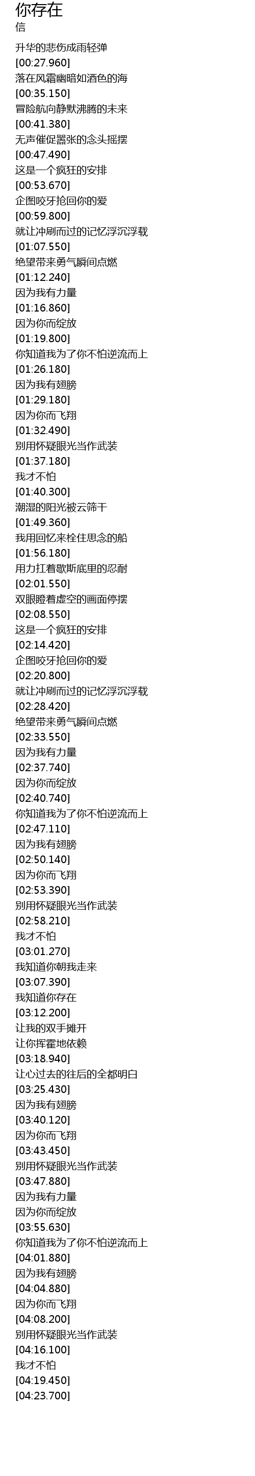 | [03:08.960] | wǒ zhī dào nǐ cún zài |