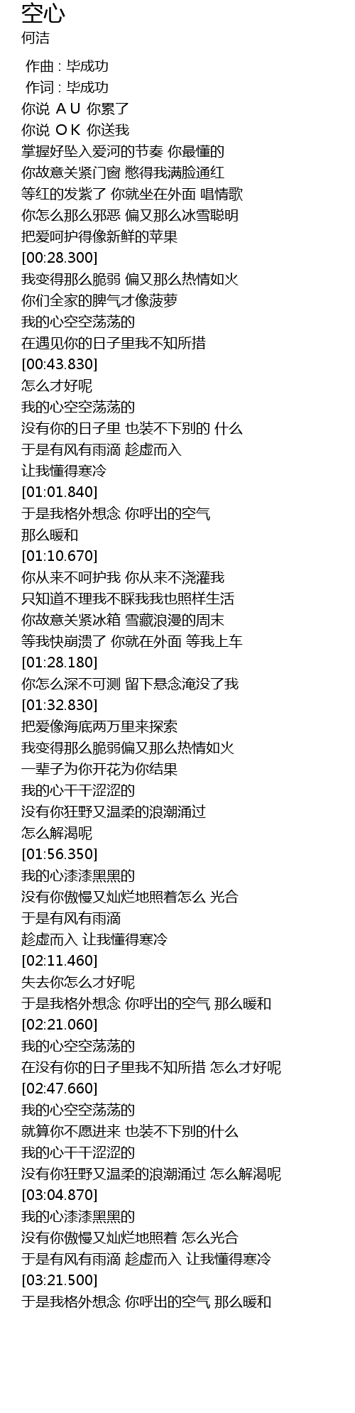 | [00:46.350] | wǒ de xīn kōng kōng dàng dàng de |