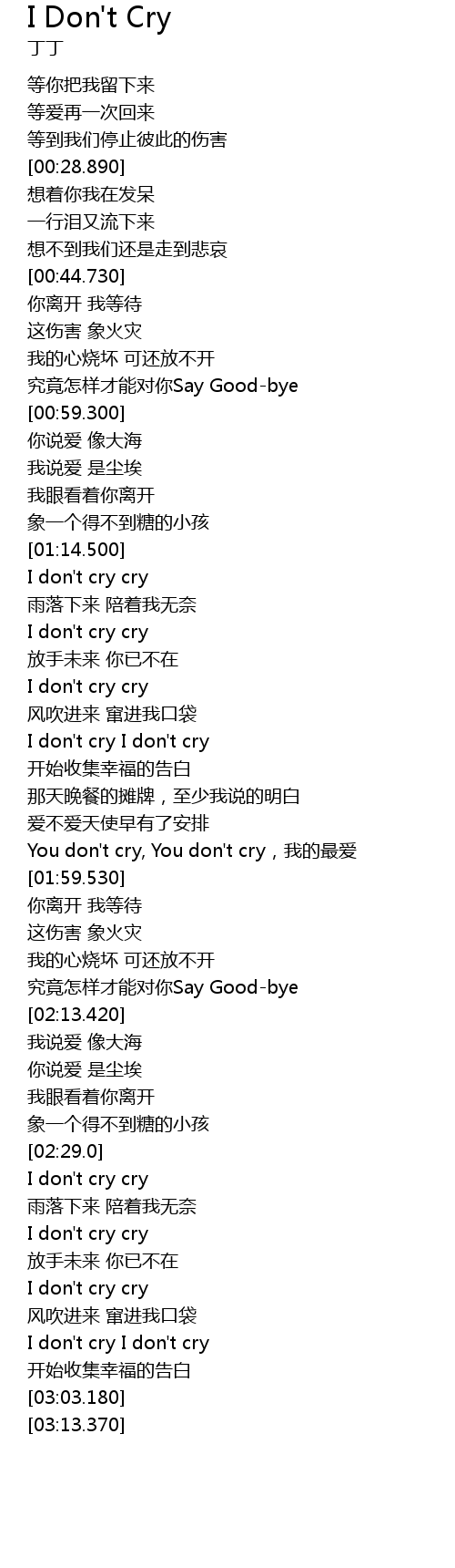 | [01:53.550] | You don' t cry, You don' t cry, wo de zui ai |