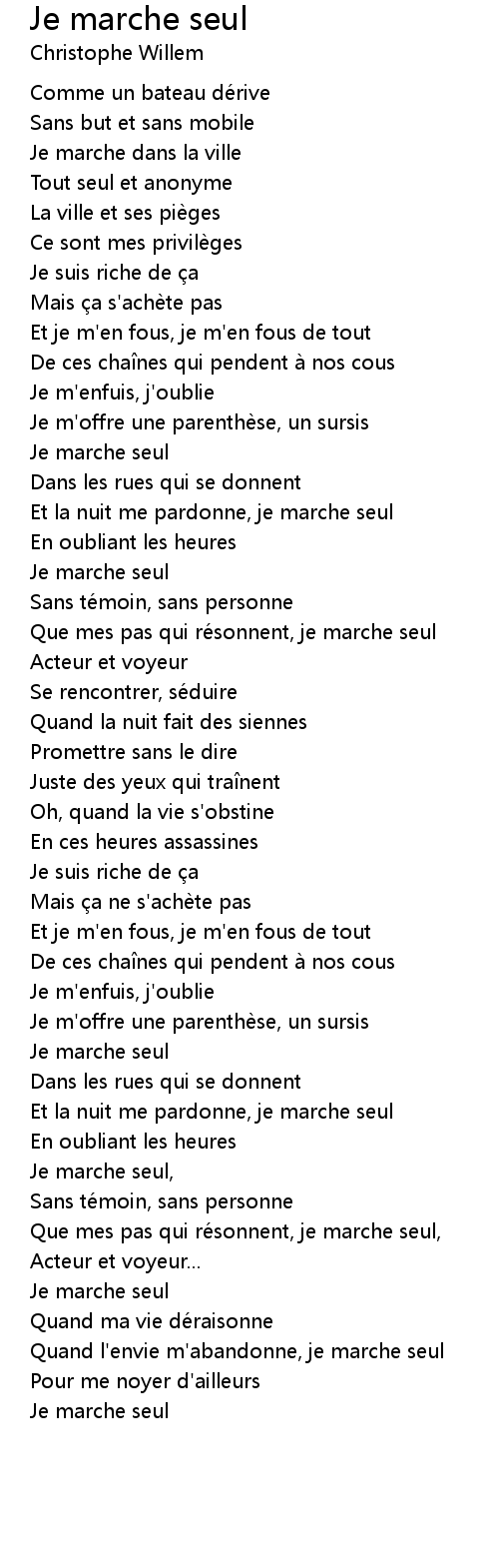 | [02:19.57] | Que mes pas qui ré sonnent, je marche seul, |