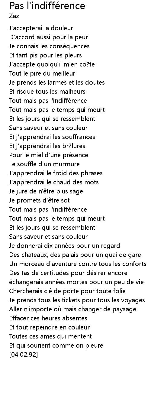 | [00:41.83] | Tout mais pas l' indiffe rence |