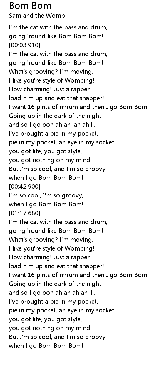 | [00:13.418] | going ' round like Bom Bom Bom! |