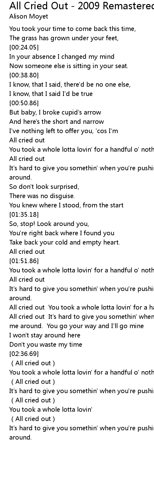 | [02:04.88] | All cried out You took a whole lotta lovin' for a handful o' nothin' All cried out It's hard to give you somethin' when you're pushin' an' a shovin' me around. You go your way and I'll go mine |
