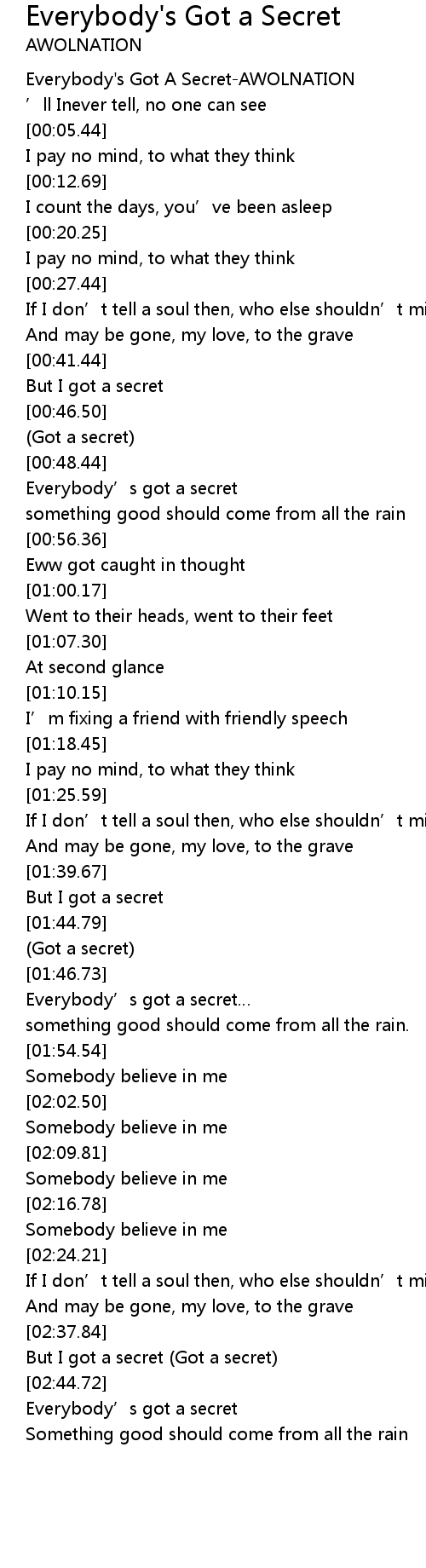| [00:00.21] | Everybody' s Got A SecretAWOLNATION |