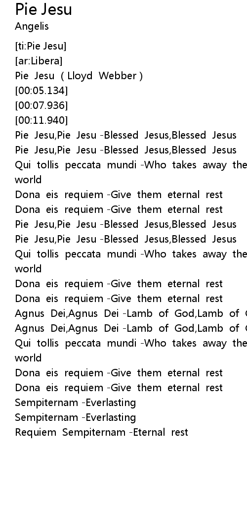 | [00:17.844] | Pie Jesu,Pie Jesu -Blessed Jesus,Blessed Jesus |