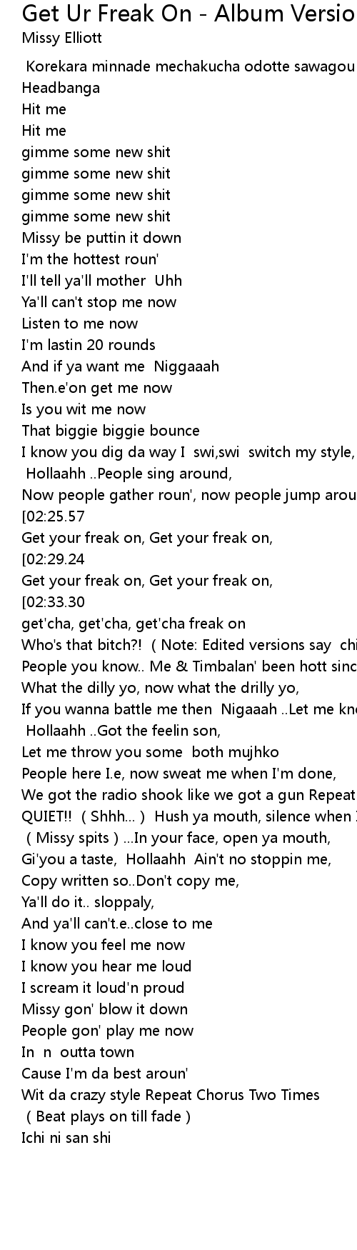 | [02:36.02][02:25.57][01:42.17][01:31.49][00:58.68][00:48.07] | Get your freak on, Get your freak on, Get your freak on, |