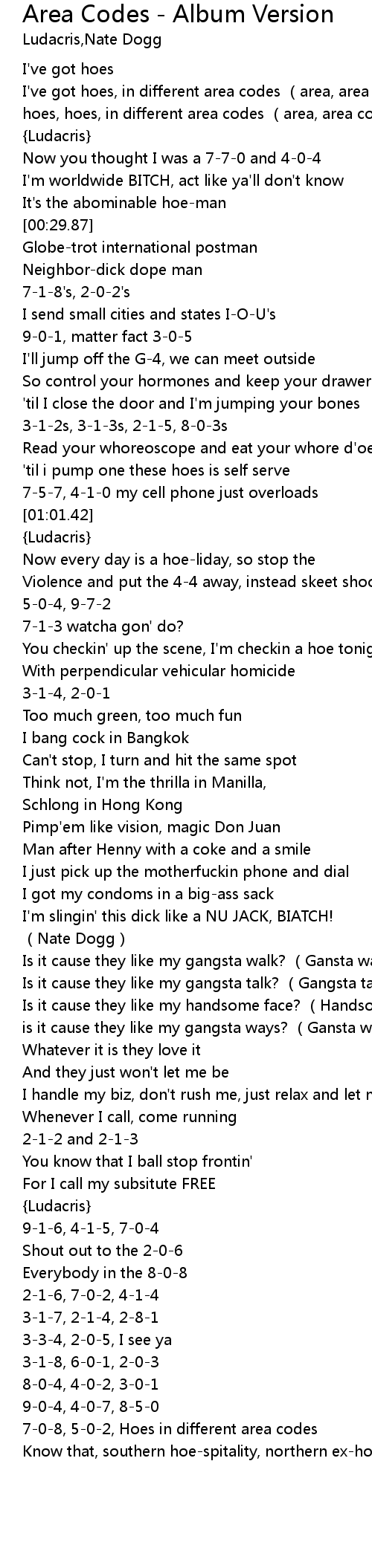 | [00:15.18] | hoes, hoes, in different area codes (area, area codes..codes) |