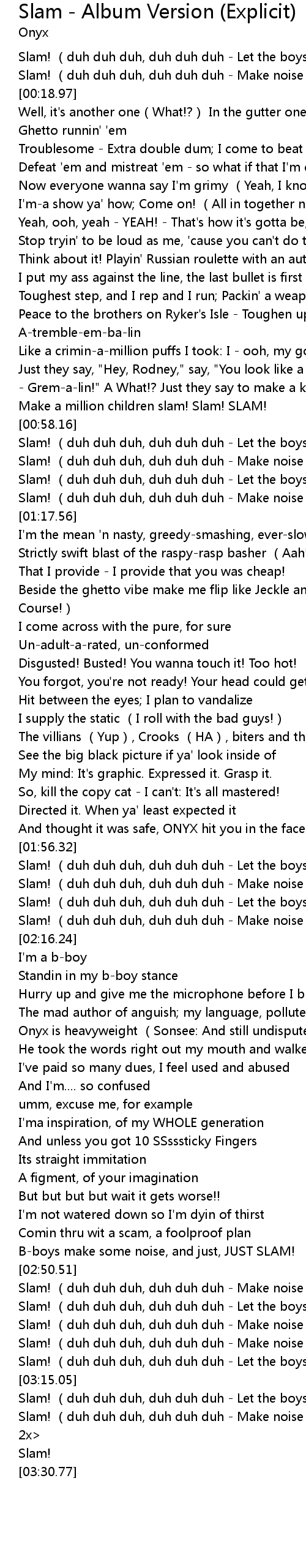 | [03:01.73] | Slam! (duh duh duh, duh duh duh - Make noise b-boys!) |