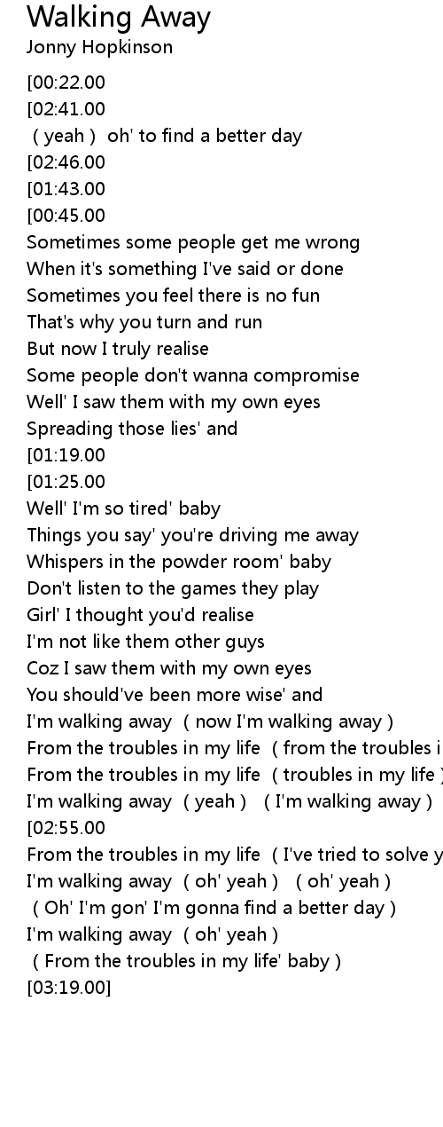 | [02:58.00][02:46.00][01:40.00][00:34.00] | I'm walking away (I'm walking away) |