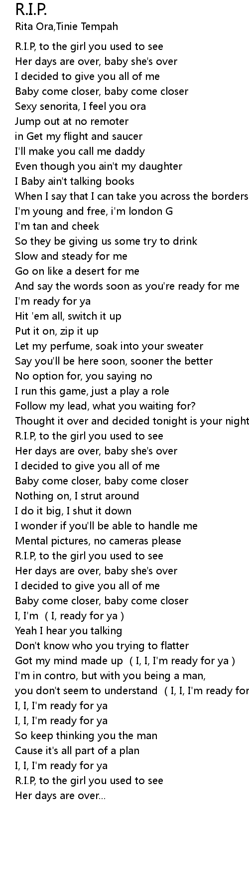 | [00:02.900] | R. I. P, to the girl you used to see |