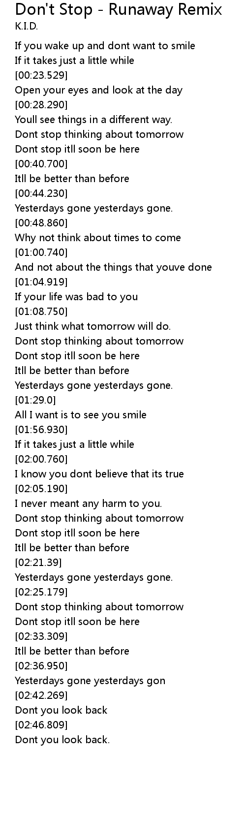 | [01:13.340] | Dont stop thinking about tomorrow |