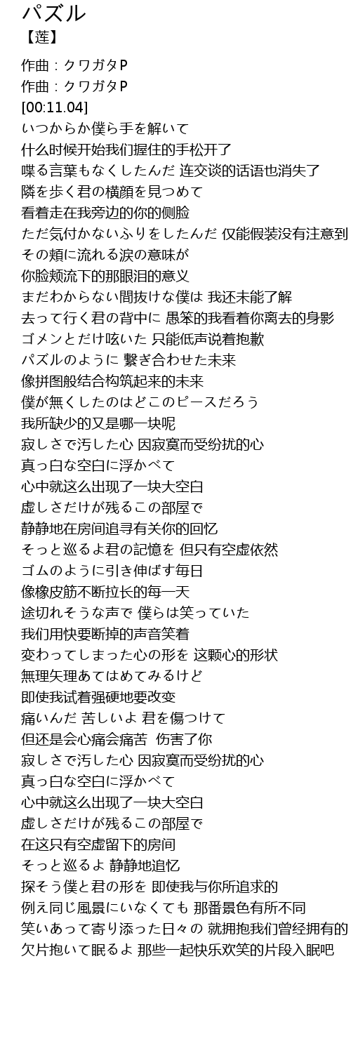 | [01:06.46] | 僕が無くしたのはどこのピースだろう 我所缺少的又是哪一块呢 |
