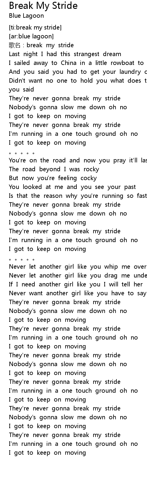 | [02:41.421] | Nobody's gonna slow me down oh no |