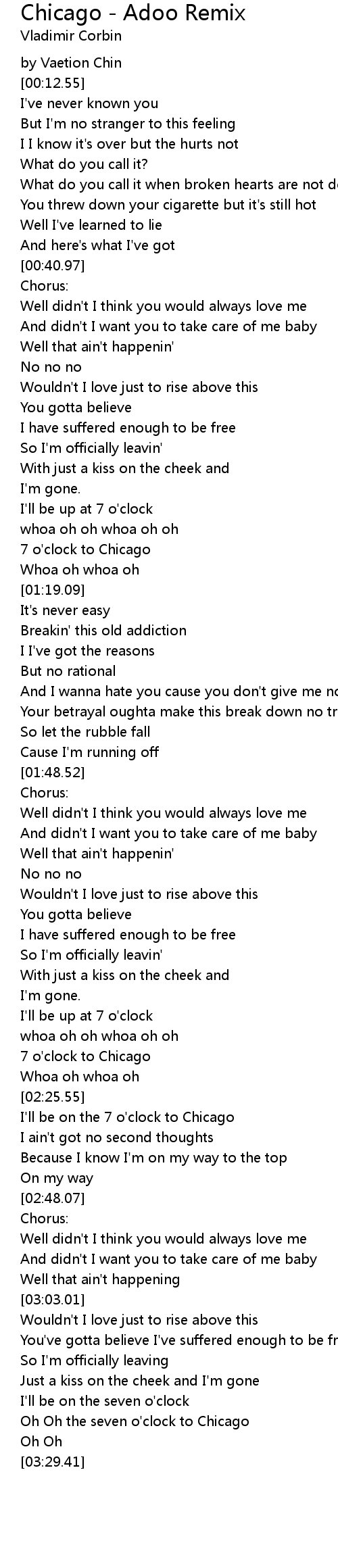 Oh Oh the seven o'clock to Chicago |