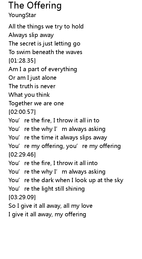 | [02:01.78] | You’re the fire, I throw it all in to |