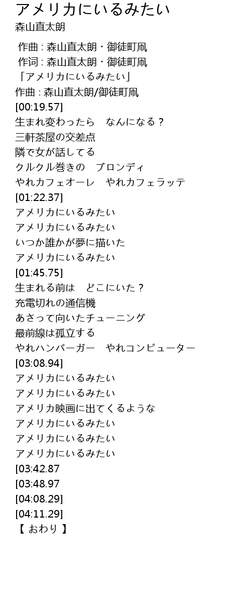 | [00:01.57] | 「アメリカにいるみたい」 |