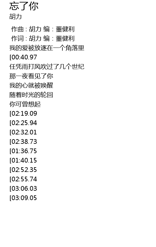 | [01:23.29][01:36.75][02:45.07][02:58.54][03:11.94][03:25.99] | 忘了你、忘了你、 |