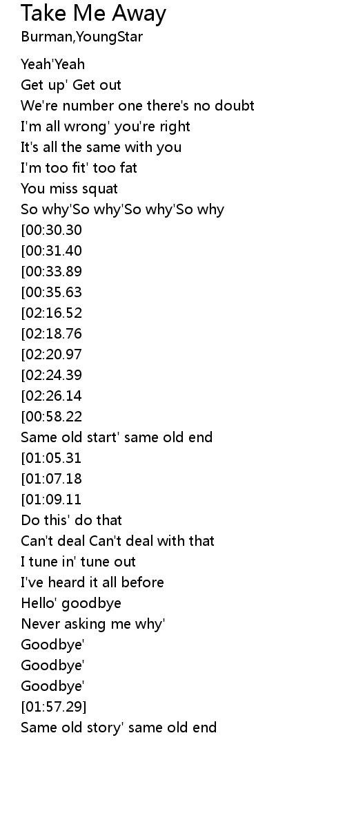 | [02:40.93][02:26.14][01:44.76][00:47.51] | Take me away'Away'Away'Away'Away' |