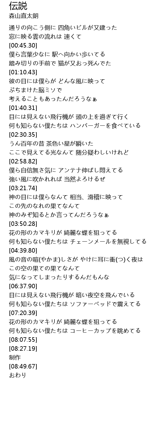 | [01:43.46] | 目には見えない飛行機が 頭の上を過ぎて行く |