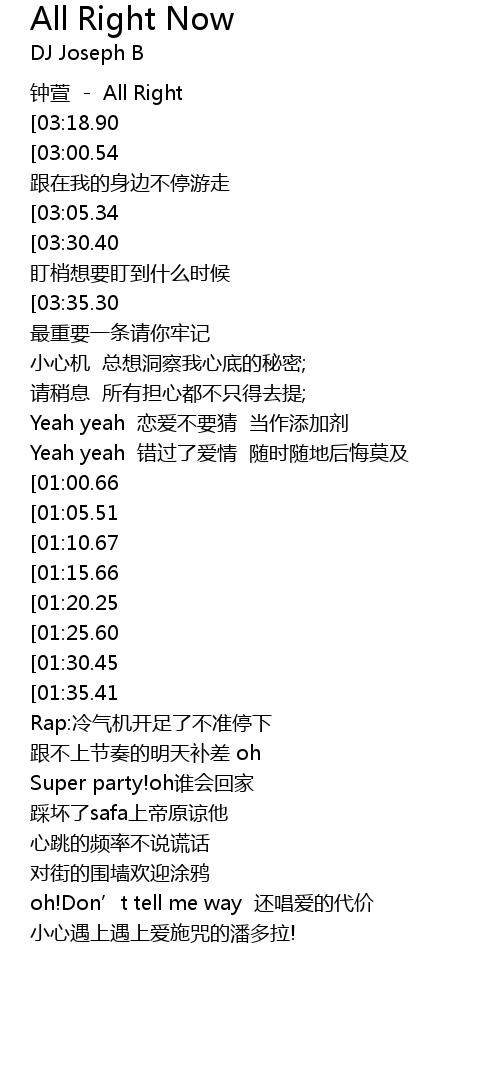 | [02:30.26][01:30.45] | all aright all right fán nǎo tōng tōng pāo dào hòu tái |