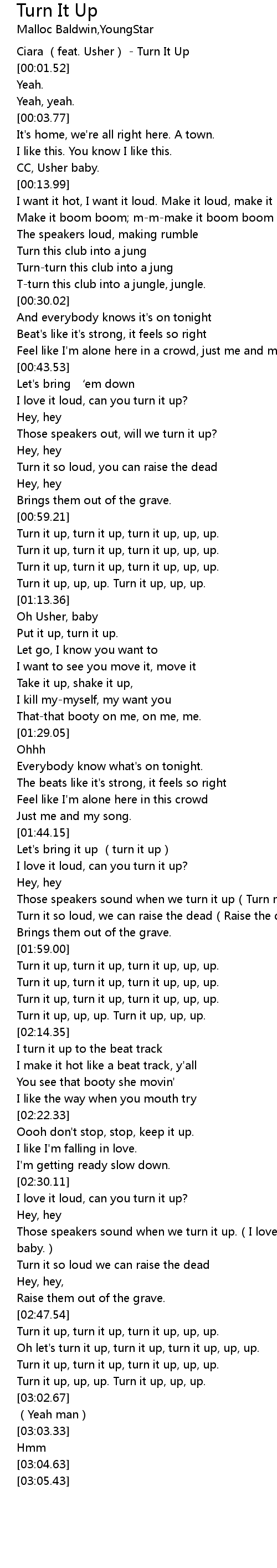| [02:55.87] | Turn it up, turn it up, turn it up, up, up. |
