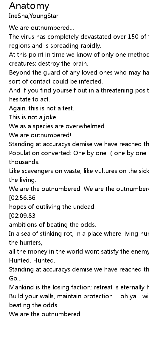 | [03:06.76][02:56.36][01:59.66][01:44.13] | Find your post, find your shelter in hopes of outliving the undead. |