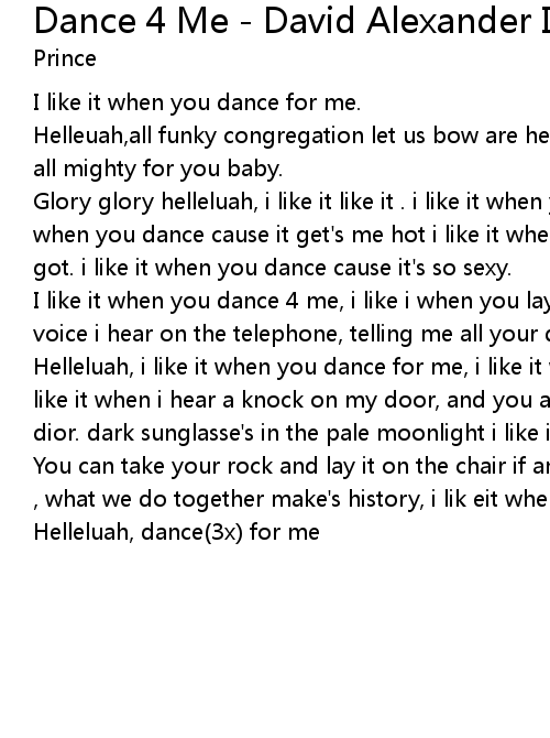 Helleluah, i like it when you dance for me, i like it when you dance for me, i like it when i hear a knock on my door, and you are standin there with christian dior. dark sunglasse's in the pale moonlight i like it when the scene is right. |