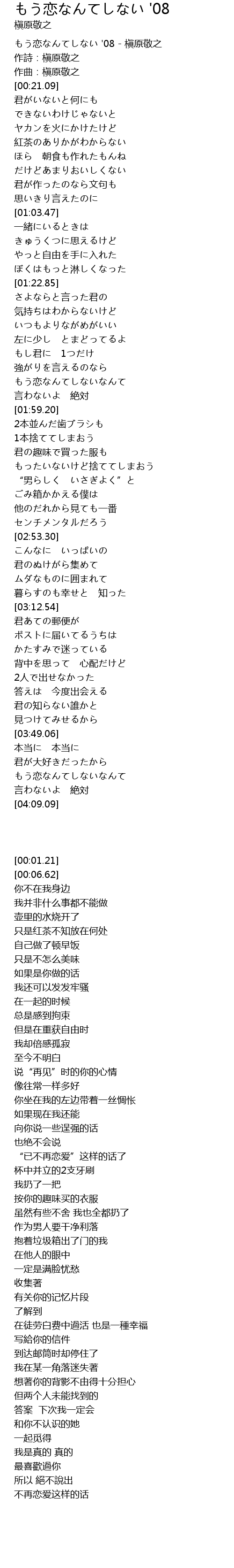 | [00:01.21] | もう恋なんてしない '08 - 槇原敬之 |